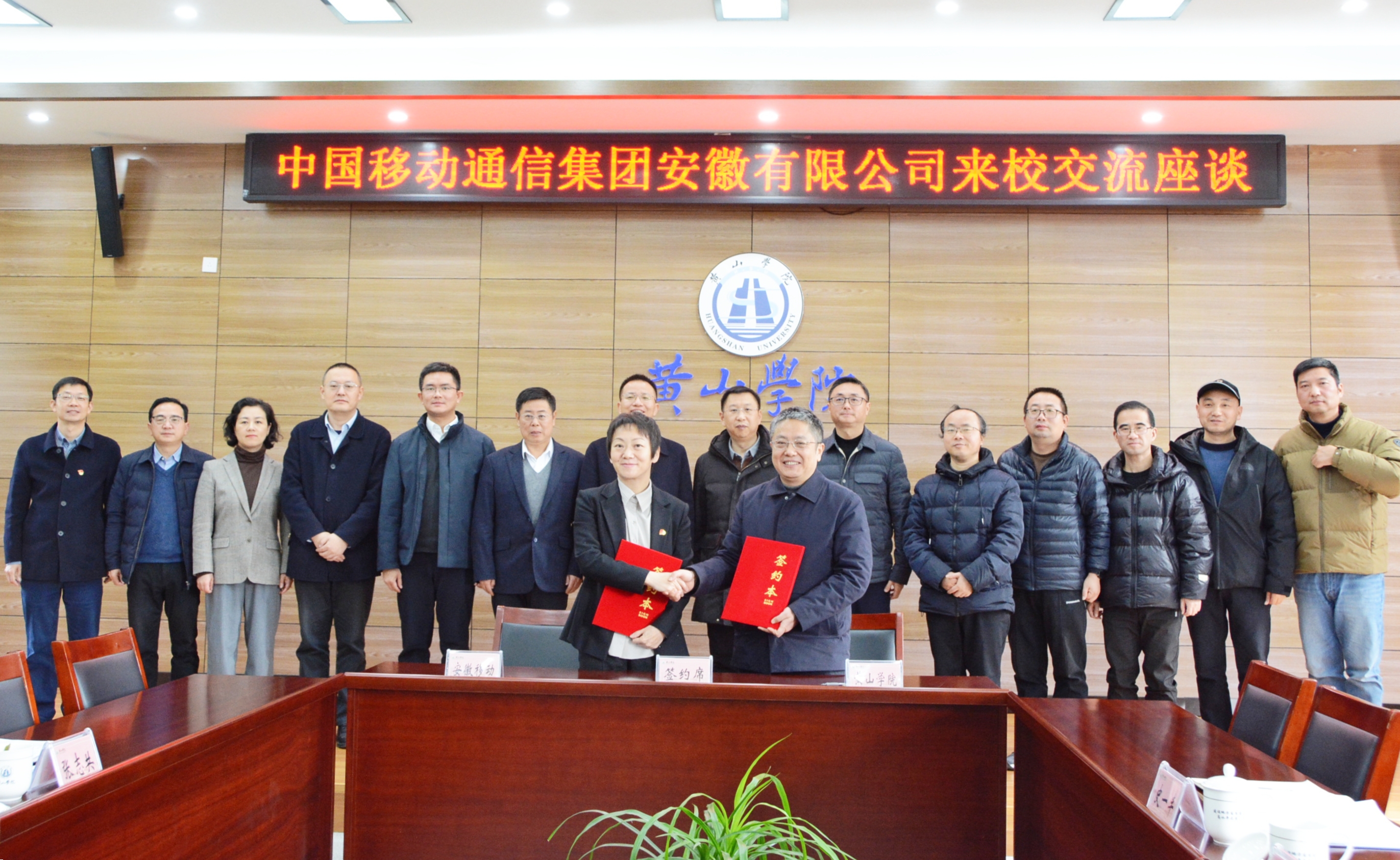12月16日上午,我校与中国移动通信集团安徽有限公司举行战略合作协议签约仪式。校党委副书记、院长李庆宏,副院长姜红,中国移动通信集团安徽有限公司党委委员、副总经理王晓慧,黄山分公司党委书记、总经理刘艳锋出席签约仪式。发展规划与社会合作处、教务处、科研处、网络与信息管理中心、信息工程学院、艺术学院、文化与传播学院相关负责人,中国移动通信集团安徽有限公司政企客户部,黄山分公司综合部、政企客户部、屯溪营销中心等部门负责人参加签约仪式。